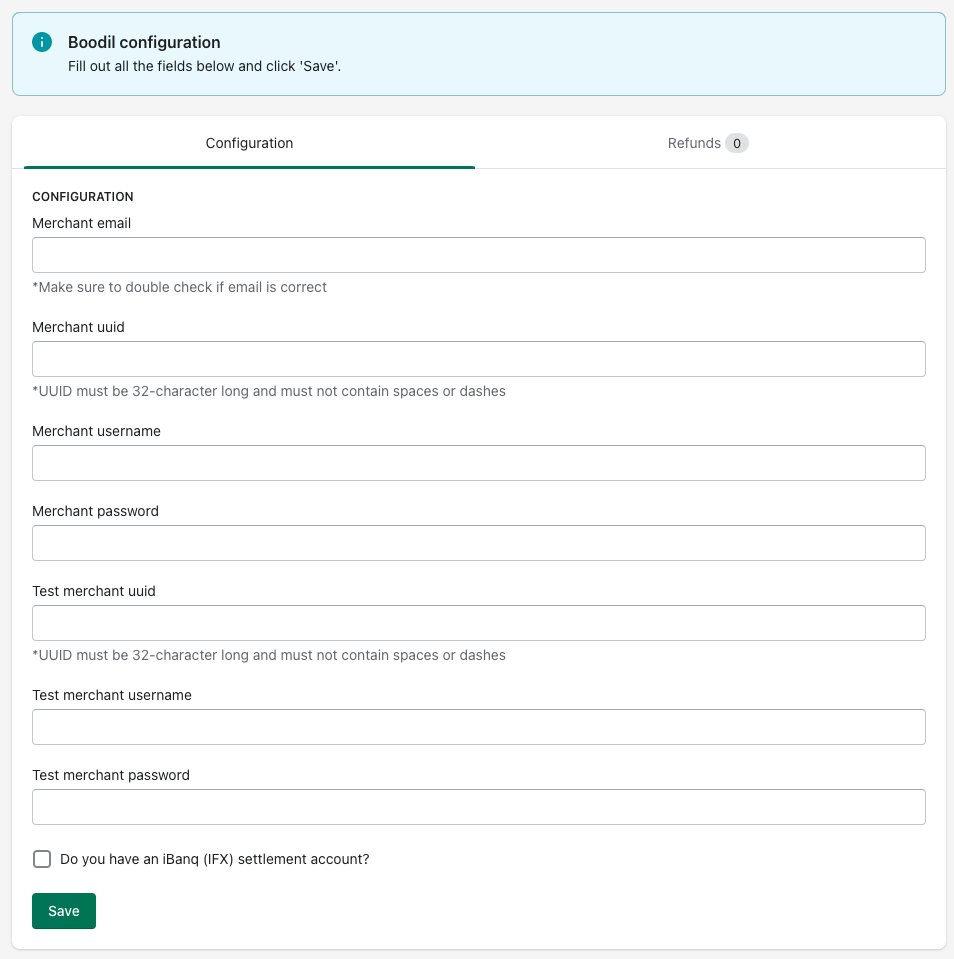 Your Boodil account credentials must be saved on the app's configuration page to allow enabling the payment method. All fields are required.