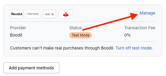 If necessary, the configuration form can be accessed via Shopify Admin. Click "Settings" > "Payments", then you can manage your Boodil credentials by clicking the "Manage" button on the displayed page.