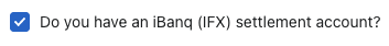 On the configuration page merchants are asked to confirm a "Do you have an iBanq (IFX) account" checkbox.