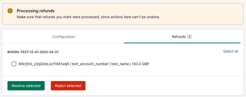 Here you can identify specific refunds by their reference number, customer name or amount. Either mark specific refunds as resolved (completed) or reject them.