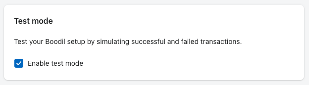 Test mode can be enabled via Shopify Admin. Click "Settings" > "Payments", then you can enable test mode by ticking the "Enable test mode" box. Payments in test mode will go through Boodil's Test API.